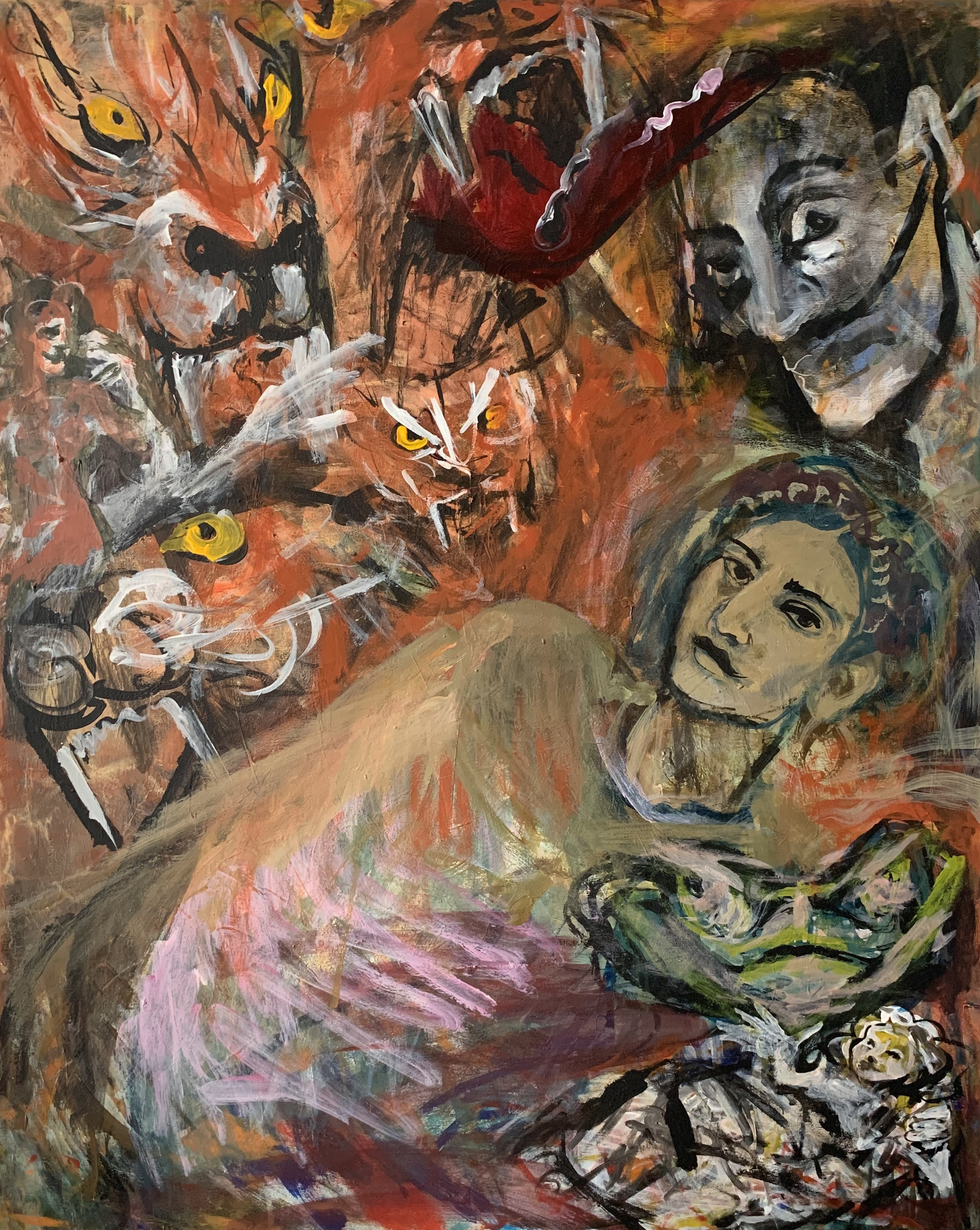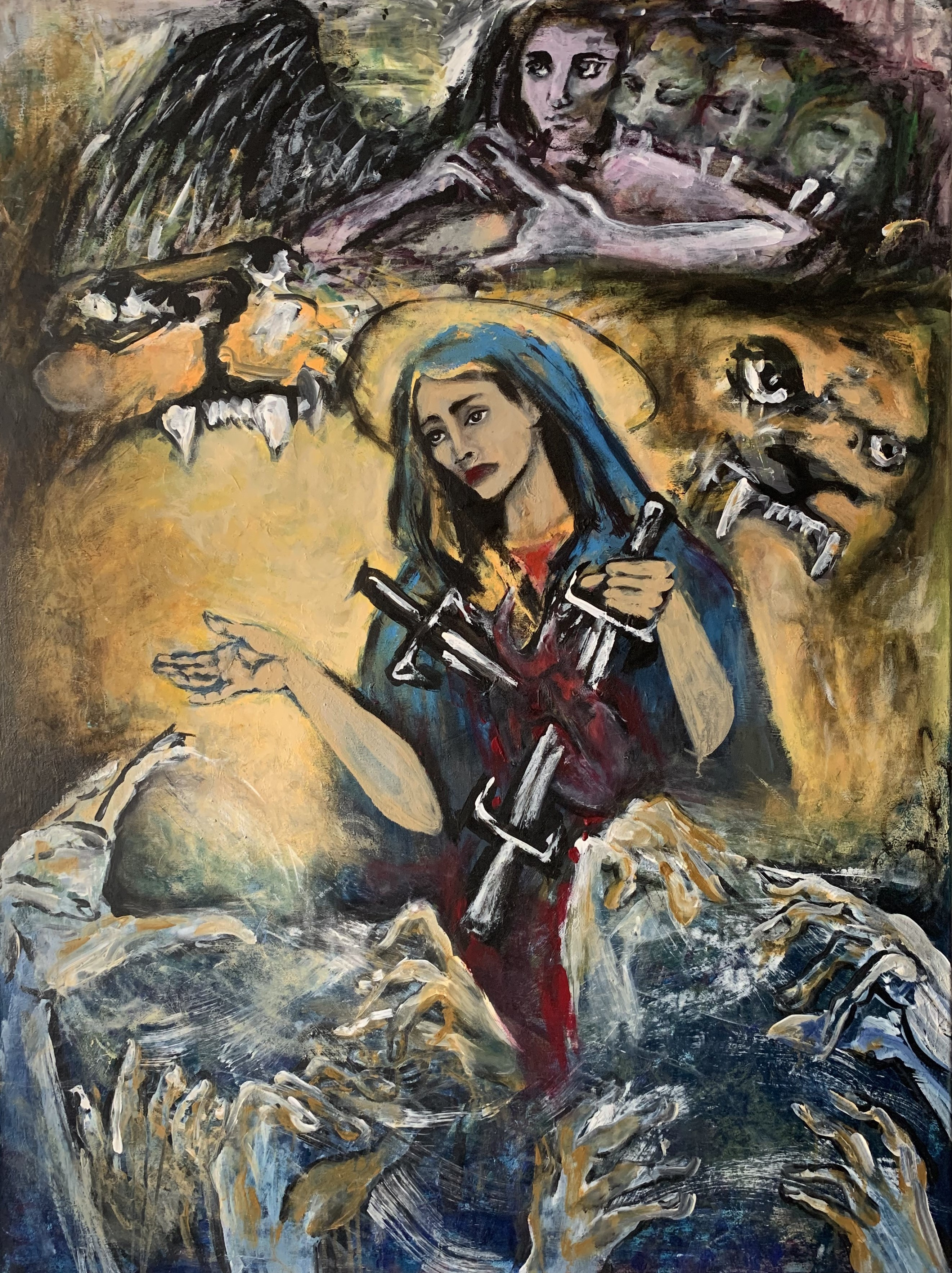 „In vielen Menschen tobt ein alter Krieg. Ein Krieg mit tausend Gesichtern, in tausend Bildern. Der Krieg im Heimatland der Künstlerin, der Krieg ihrer und unserer Vorfahren gegen- und miteinander, der Krieg der Mächtigen gegen die Ohnmächtigen, der Krieg gegen die Frauen, die Kriege unserer Vorväter, die Tränen der Mütter um ihre Söhne, der Schmerz der Väter um ihre Töchter, der Krieg, der auf dem Schlachtfeld des Geistes von Priestern um die Seelen der Menschen geführt wurde, der Krieg, der immer eine Begründung findet, aber keine Berechtigung.