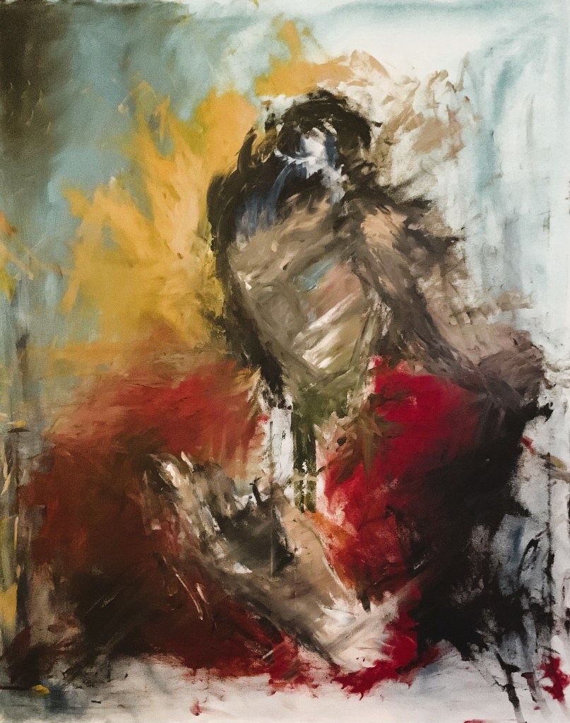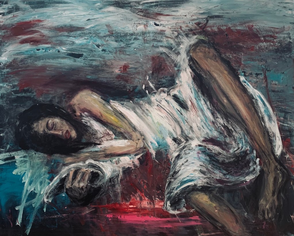 Doña Juanita schläft über der Lektüre von Gabriel García Márquez’ Hundert Jahre Einsamkeit ein // Doña Juanita se queda dormida leyendo Cien años de soledad de Gabriel García Márquez // Doña Juanita falls asleep reading One Hundred Years of Solitude by Gabriel García Márquez (Matthias Thiele // Felizitas:Immer // acrylic on canvas, 80×100, Nov. 2022)